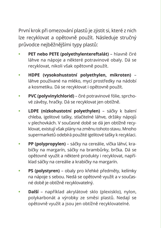 Úspěšné zvládnutí nadměrného využívání plastů lze shrnout do tří hlavních principů: omezit, opakovaně použít a recyklovat. Téměř všechny tipy v této publikaci vysvětlují, jak nalézt druhé či třetí využití plastů určených na jedno použití, jak plasty vhodně recyklovat a jak si lépe vybírat zboží s cílem omezit množství plastů, které používáme. Skvělý způsob, jak začít omezovat spotřebu plastů, je zaměřit se na předměty každodenní potřeby.