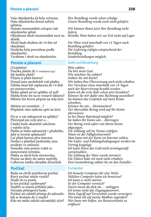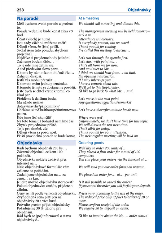 Mluvník navíc obsahuje i množství obratů a vět řazených tematicky podle konkrétních situací, jako je např. komunikace (telefonování, elektronická pošta a počítač, schůzka, vyjednávání), doprava (služební cesta, rezervace ubytování), žádost o práci (pohovor) nebo provozní obraty (fakturace, objednávky, propagace a reklama, pojištění, reklamace).
