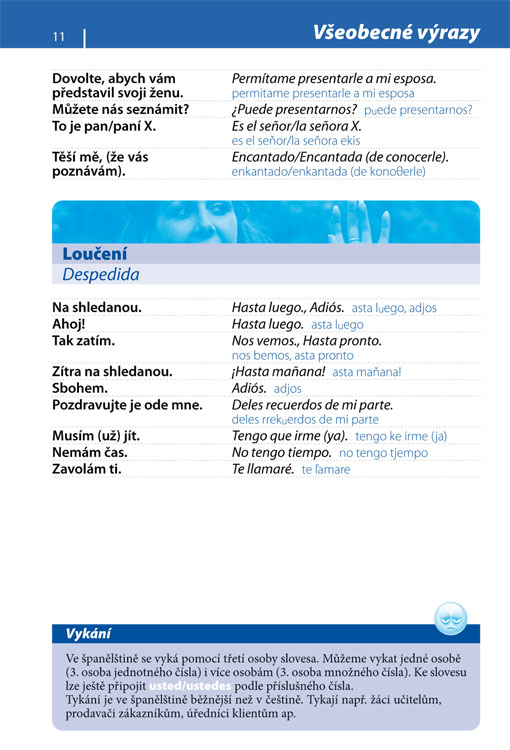Konverzace je členěná tematicky, nabízí slovní zásobu a fráze pro desítky situací (číslovky, udávání času, představování, cestování (autem, letadlem, vlakem, městskou dopravou), ubytování, stravování, sport, seznamování, prohlídka města, nakupování, rodina, práce a brigáda, banka, komunikace a počítač...). Užitečnou přílohou je oboustranný španělský slovníček.