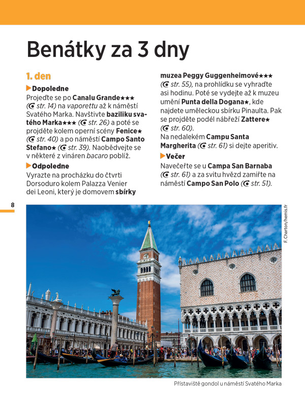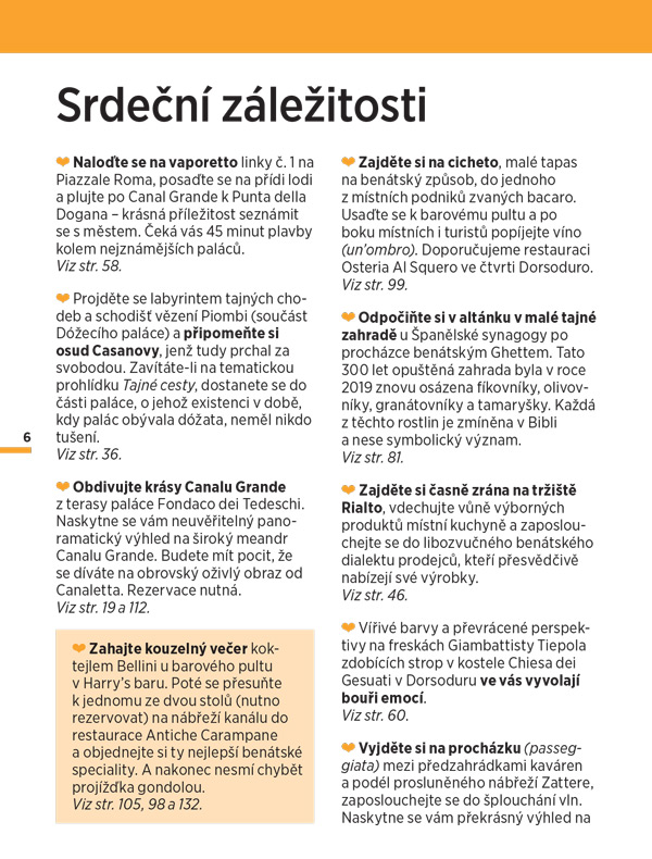 Náš průvodce představí hlavní srdeční záležitosti. Kromě popisu památek v průvodci najdete řadu zajímavostí, například o malířství, dějinách a umění, laguně a životě na vodě nebo o maskách a karnevalech.