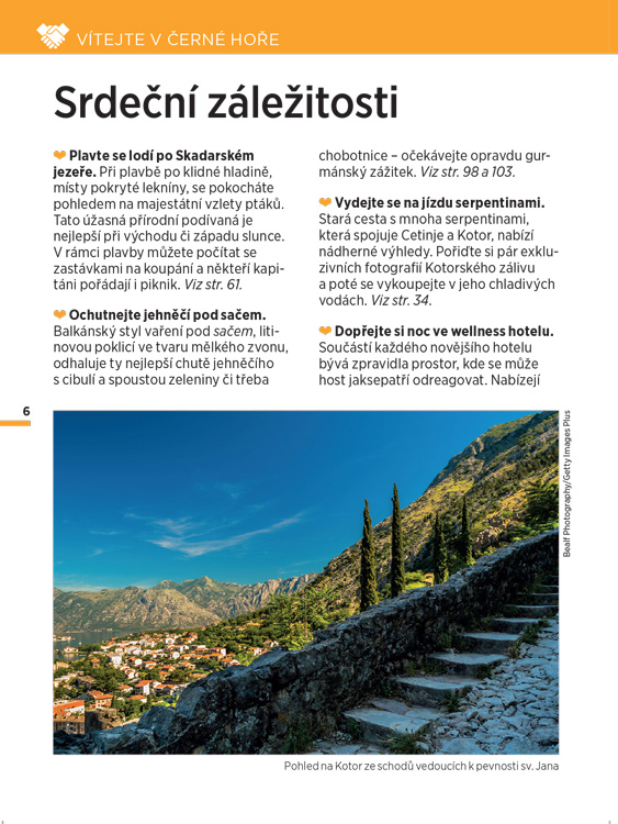 Na malé ploše najdete neuvěřitelné množství zajímavostí, které stojí za to vidět. Jedním slovem fascinující je i historie země – leží totiž přímo na pomyslné hranici mezi Východem a Západem a její podobu za poslední dvě tisíciletí utvářeli mimo jiné Řekové, Římané, Benátčané, Rakušané či Osmané. Každý kousek této přitažlivé destinace skrývá něco jedinečného a díky našemu průvodci nic z toho nezmeškáte. Černá Hora je ideální destinací pro milovníky pěší či horské turistiky, jízdy na kajaku či raftingu. Pokud se mezi ně počítáte, určitě se vydejte do některého z pěti černohorských národních parků (Durmitor, Biogradska Gora, Skadar, Prokletije a Lovćen).