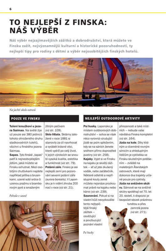 Nový velký průvodce na cesty do Finska. Nechte se inspirovat poutavými fotografiemi a vydejte se letos na sever. Náš průvodce nabízí výběr těch nejzajímavějších míst a dobrodružství. Nenajdete tu úžasné fjordy a působivých starých měst je jen několik, zato si ale v této zemi tisíce jezer užijete přírody a aktivit, o kterých se vám dosud ani nesnilo. Finská příroda tak rozmanitá a přístupná, že jediným limitem je vlastní představivost.