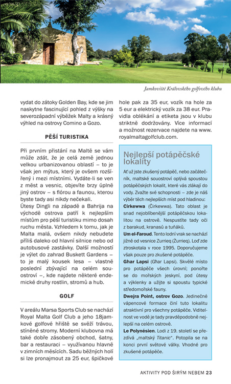 Jak sever, tak jih Malty nabízejí také pěkné pobřežní stezky, po kterých se můžete vydat, zatímco ostrov Gozo lze celý obejít pěšky prakticky za jediný den. Na ostrovech najdete kamenité i písečné pláže a skvěle vybavené hotely. Nejlepší pláže jsou na severu Malty a na ostrově Gozo, kde je i okouzlující záliv Ramla Bay. Rozhodně si nenechte ujít návštěvu Modré laguny. Toto místo na ostrově Comino je jednou z nejpozoruhodnějších pláží na světě. A konečně atmosféru Malty doladí i návštěva nějaké slavnosti nebo trhů.