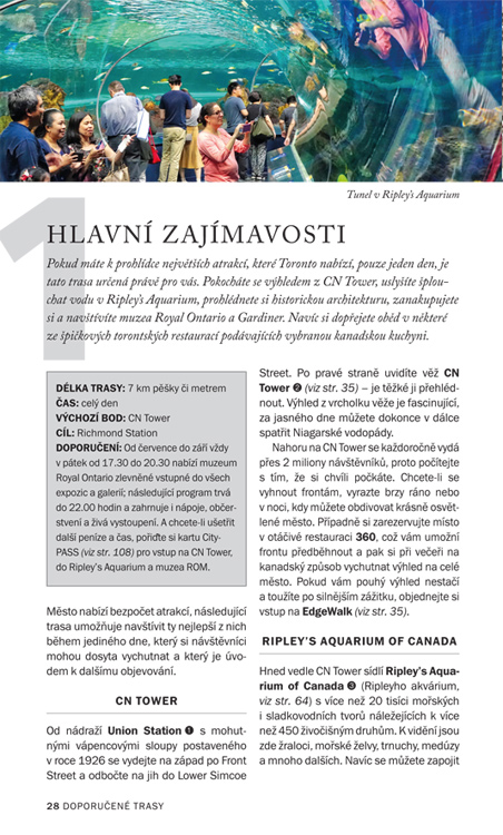 Poznejte to nejzajímavější z Toronta a okolí na 13 prohlídkových trasách. U každé trasy najdete podrobný popis, orientační časovou náročnost, mapku, ilustrační fotky a tipy, kde se na procházce občerstvit. Při svých cestách za poznáním oceníte podrobnou rozkládací mapu Toronta, na které jsou jednotlivé trasy také vyznačeny.