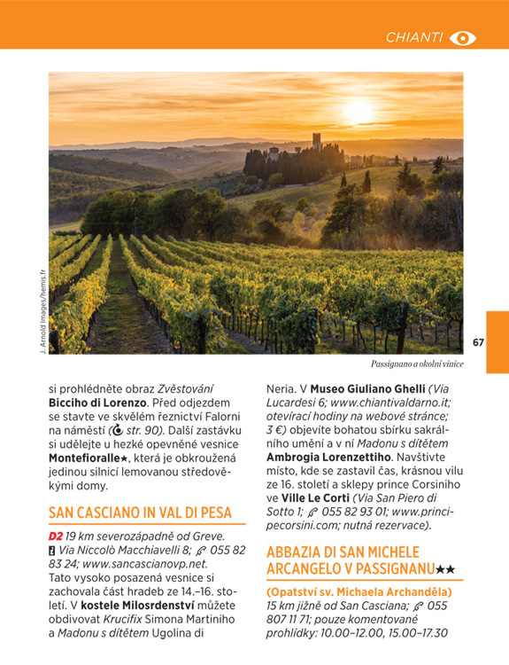 Průvodce popisuje města Florencie, Lucca, Pisa, San Gimignano, Volterra, Siena, Chianti, Pienza, Maremma a Arezzo. Ve Florencii stojí proti sobě středověká a renesanční architektura a společně vytvářejí kulisy jako z krásného obrazu. Město vás určitě vtáhne do víru emocí. Světoznámé památky jsou tu na každém kroku, atmosféra je nepopsatelná. Načerpejte inspirace z kreativního ducha, který ovlivnil celou Evropu. Lucca, rodné město hudebního skladatele Giacoma Pucciniho, si zachovalo tajemný středověký vzhled. Pisa uchvacuje jedním z nejkrásnějších architektonických komplexů na světě, Piazza dei Miracoli i slavnou šikmou věží. Ve vesnici San Gimignano obehnané dvojitou hradbou se k nebi tyčí jedinečné středověké domy v podobě věží. V malé vesnici Volterra se nachází jedno z nejhezčích středověkých náměstí Itálie. Siena, odvěký sok Florencie, je zhmotněním středověkého města a dnes je proslulá koňskými závody. Pienza je další ukázka renesančního města. Vinařská oblast Chianti nabízí vítaný únik od reality, vesnice na kopcích v oblasti Maremma malebná náměstí a nedotčené středověké uličky. A nakonec bohaté Arezzo, které je známé výrobou zlatých šperků a svým nakloněným náměstím.